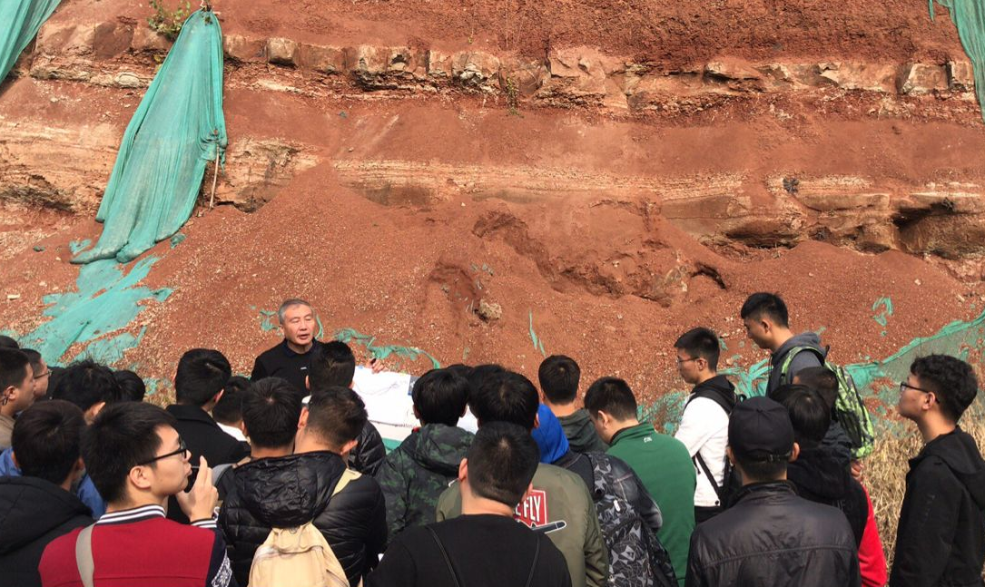 土木工程学院地下工程及岩土工程教研室于2018年11月分批次组织2016级土木本2班、3班,17土木本1班开展了普通地质及工程地质野外现场教学活动。分为校内与校外两个环节,校内环节中主要教学内容主要有:(1)参观岩土样本实验室,三大类岩石矿物以及红土矿物组成、物理力学性质、地质成因;(2)理工楼前层岩层地质年代、成因、产状以及地质罗盘的使用方法;(3)社科楼前水塘的水文地质情况、水类型与其产生的危害、治理方法;(4)艺术楼后黄土状土的形成以及阶地形成与浉河关系;(5)我校地质公园原生奇石的形成历史;(6)岩质边坡稳定性及节理统计。校外环节主要教学内容有:(1)职业技术学院参观土质边坡滑坡,介绍滑坡产生机理与治理方案;(2)北环路讲解了不同环境下形成的三个地层;(3)十一大街介绍了地层、滑坡、阶地、小断层。