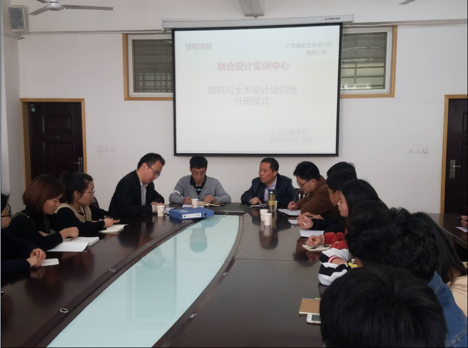 2018年4月16日中午在理工楼201隆重召开太阳集团与广东建筑艺术设计院有限公司联合设计实训中心,建筑与土木设计培训开班仪式。广东建筑艺术设计院有限公司董事、副院长、河南省分院院长叶建平、土木工程学院书记潘卫国、尹祖兴老师、王亮老师及土木工程学院、文学院、艺术学院的部分学生参加了本次开班仪式。