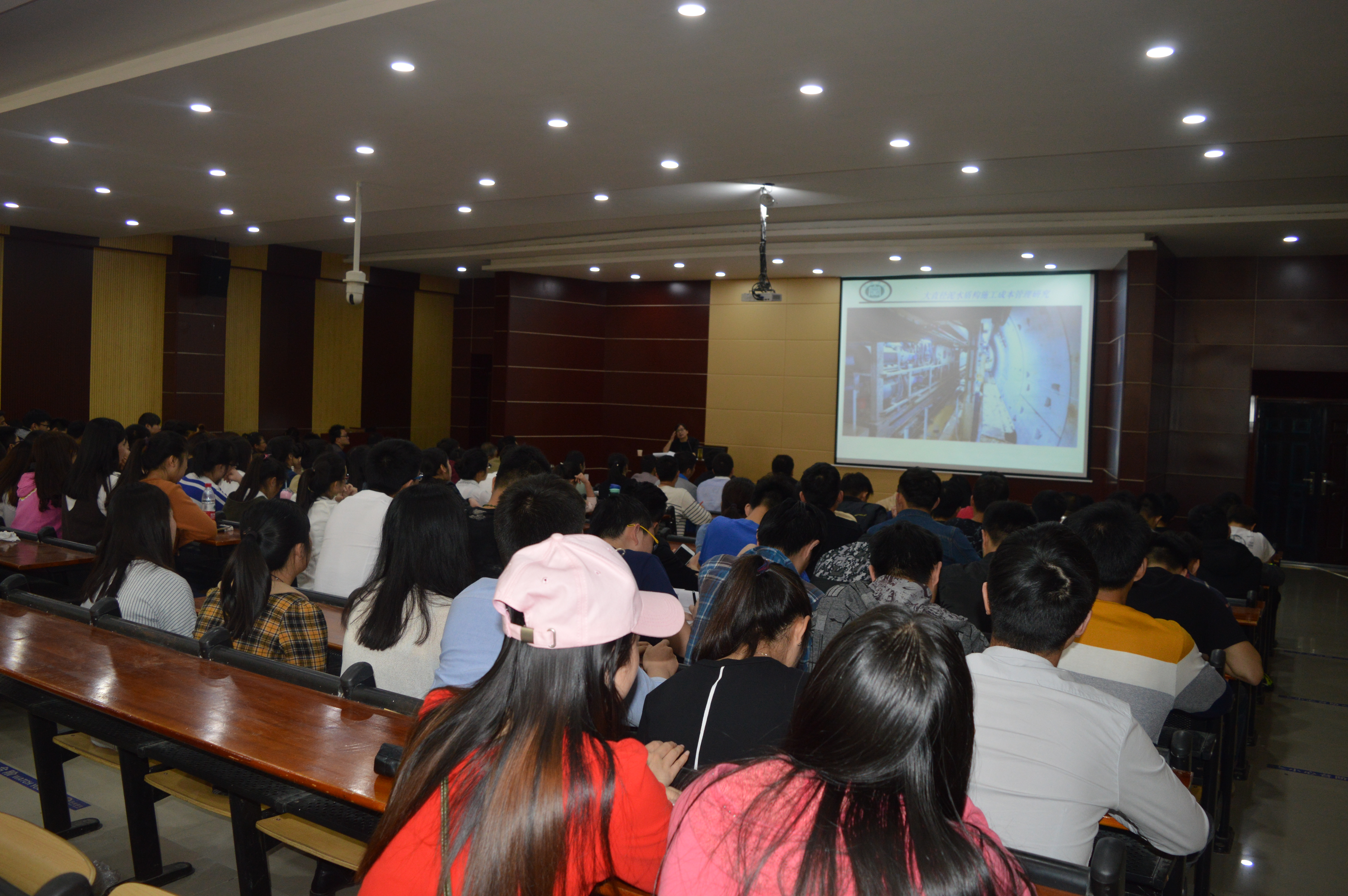 报告会上,刘教授首先介绍了隧道暗挖法施工及世界上最先进的超大型隧道掘进专用设备——(12.10米)大直径泥水盾构机,并就武汉市地铁8号线越江隧道项目大直径泥水盾构施工成本管理遇到的特殊问题及后期采取的解决方案,详细介绍了编制12米级泥水盾构企业定额的方法、主要问题及现实意义。刘教授还结合多年来组织指导学生参加全国高校BIM设计大赛的经验,就工程管理专业发展特点及BIM技术的应用为工程管理专业学生做了详细讲解,鼓励同学们要加强自身专业技能训练,积极参加各类专业赛事,促进综合能力提升。