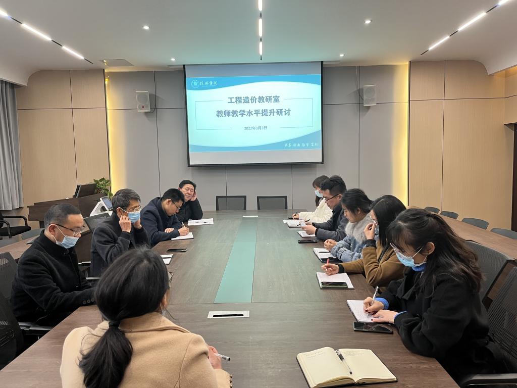 为提高教师教学质量,帮助青年教师快速站稳讲台,2022年3月3日,土木工程学院工程造价教研室在理工楼112会议室召开教师教学水平提升专题研讨会。土木工程学院书记郭二军,督导王国际教授,邱荣茂教授、朱洪涛副教授及工程造价教研室全体教师参加了会议,会议由教研室主任方超主持。