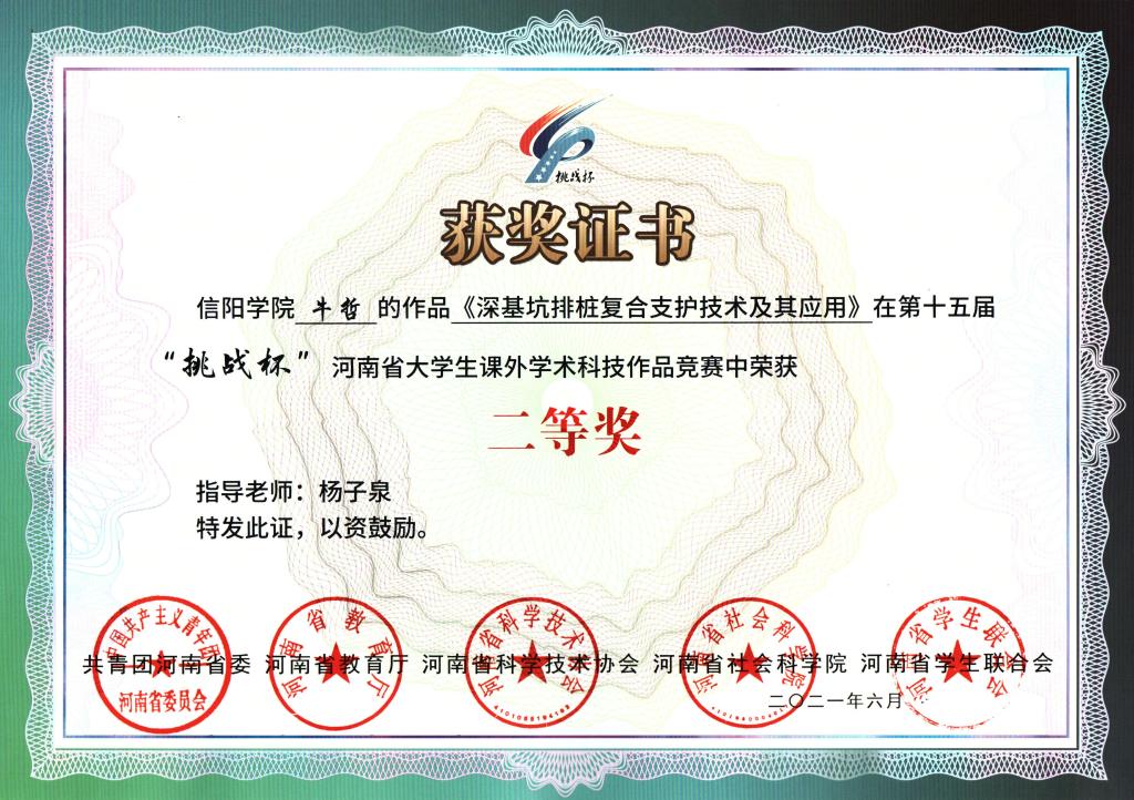 与此同时,他也注重引导学生参加科研项目,培养学生的创新性思维。他指导的2018级土木工程专业学生牛哲完成的科研论文《深基坑排桩复合支护技术及其应用》,荣获第十五届“挑战杯”河南省大学生课外学术科技作品二等奖。