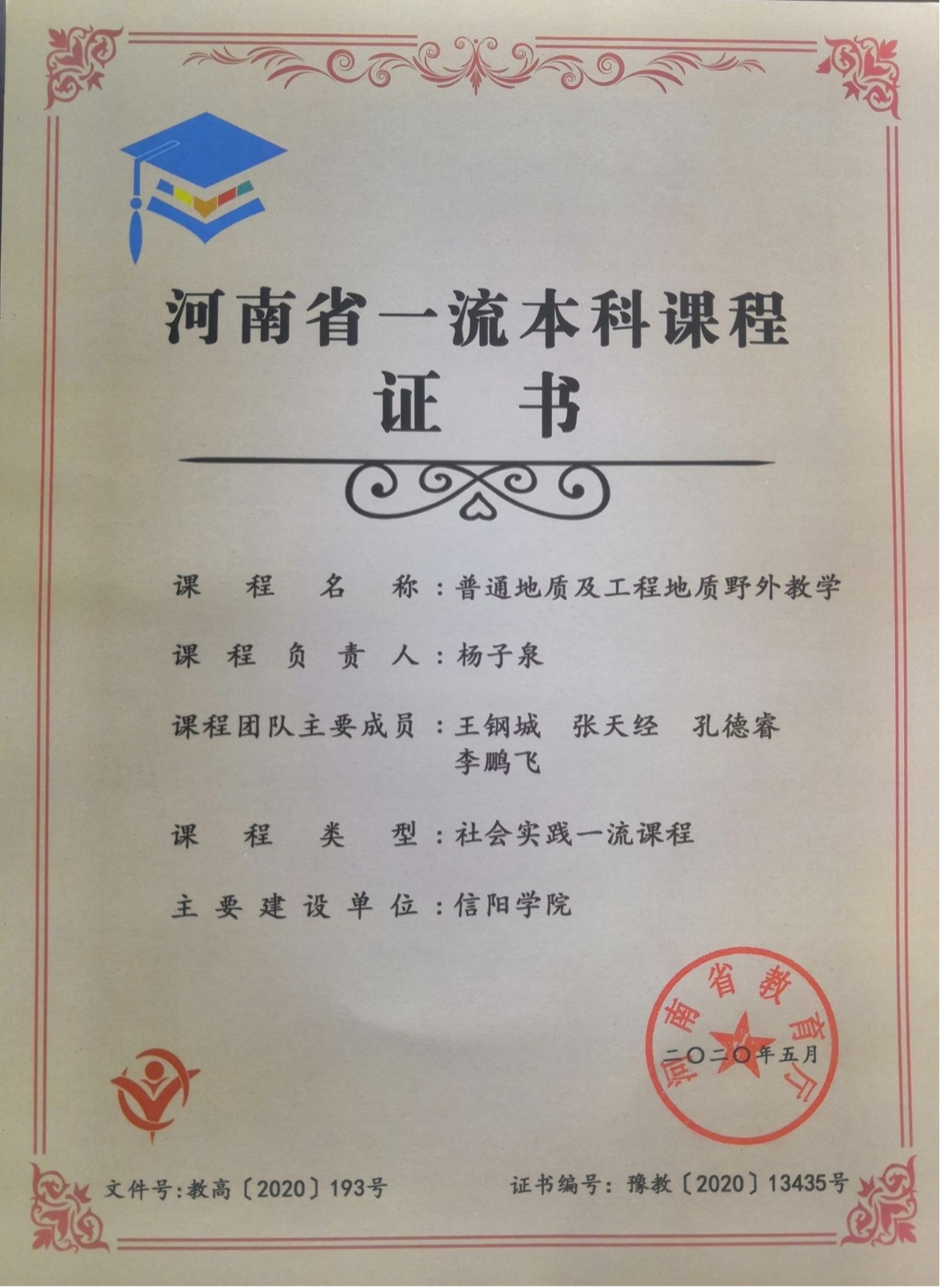 结合土木工程专业对应用型人才培养的要求,需要培养学生从工程地质角度出发分析工程问题的能力。杨老师充分利用信阳地区特有地质现象与太阳集团独有地质构造(河流阶地、单斜构造)、地质景观(原生态怪石、石笋、石幔、钟乳石、丘陵地貌),于2016年开设了实践课程《普通地质及工程地质野外实习》。同时,他利用假期到信阳上天梯、驻马店、湖北麻城等地采集岩土样本,建立了岩土样本实验室。经过四年的建设,该课程获批河南省首届一流本科课程。