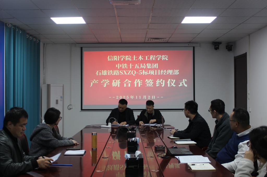 中铁十五局石雄铁路SXZQ-5标项目副总经理部高磊致欢迎辞并介绍企业发展情况,表达与我院进一步合作的愿景,分别从人才引进培养机制、未来科技前沿目标、校企合作方向等方面进行介绍。余沛副教授与中铁十五局石雄铁路SXZQ-5标项目经理部高副总经理共同签订《产教研合作协议》,明确以党建为引领,深化在人才培养、科研创新、工程实践等领域的合作。