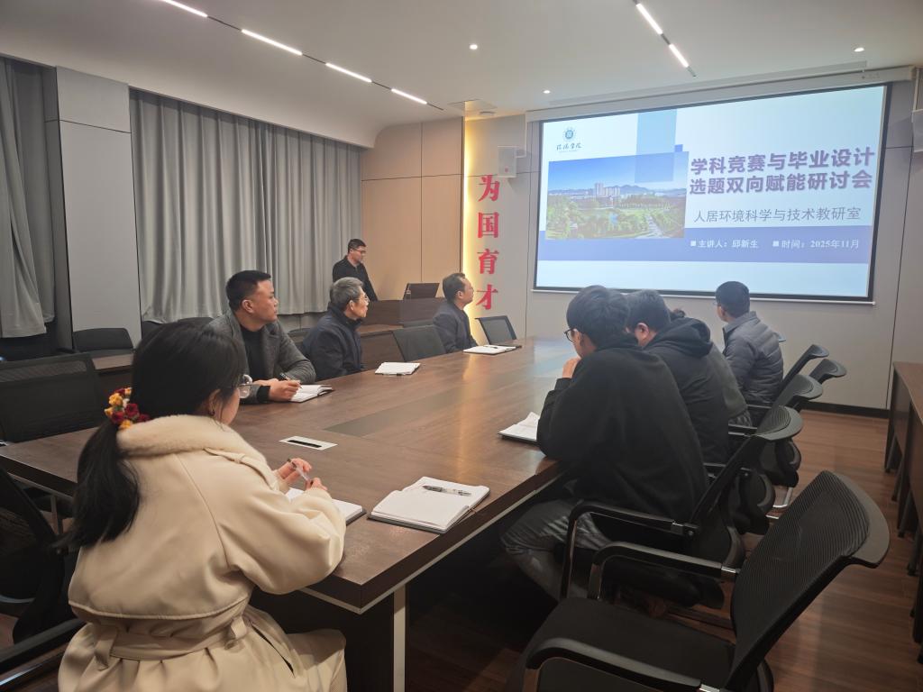11月18日下午,人居环境科学与技术教研室在理工楼112会议室成功举办“学科竞赛与毕业设计选题双向赋能”专题研讨会。学校督导专家邱荣茂教授、余沛副教授,土木工程学院教学副院长杨子泉及教研室全体教师参加本次研讨。会议由教研室主任韩冰主持。