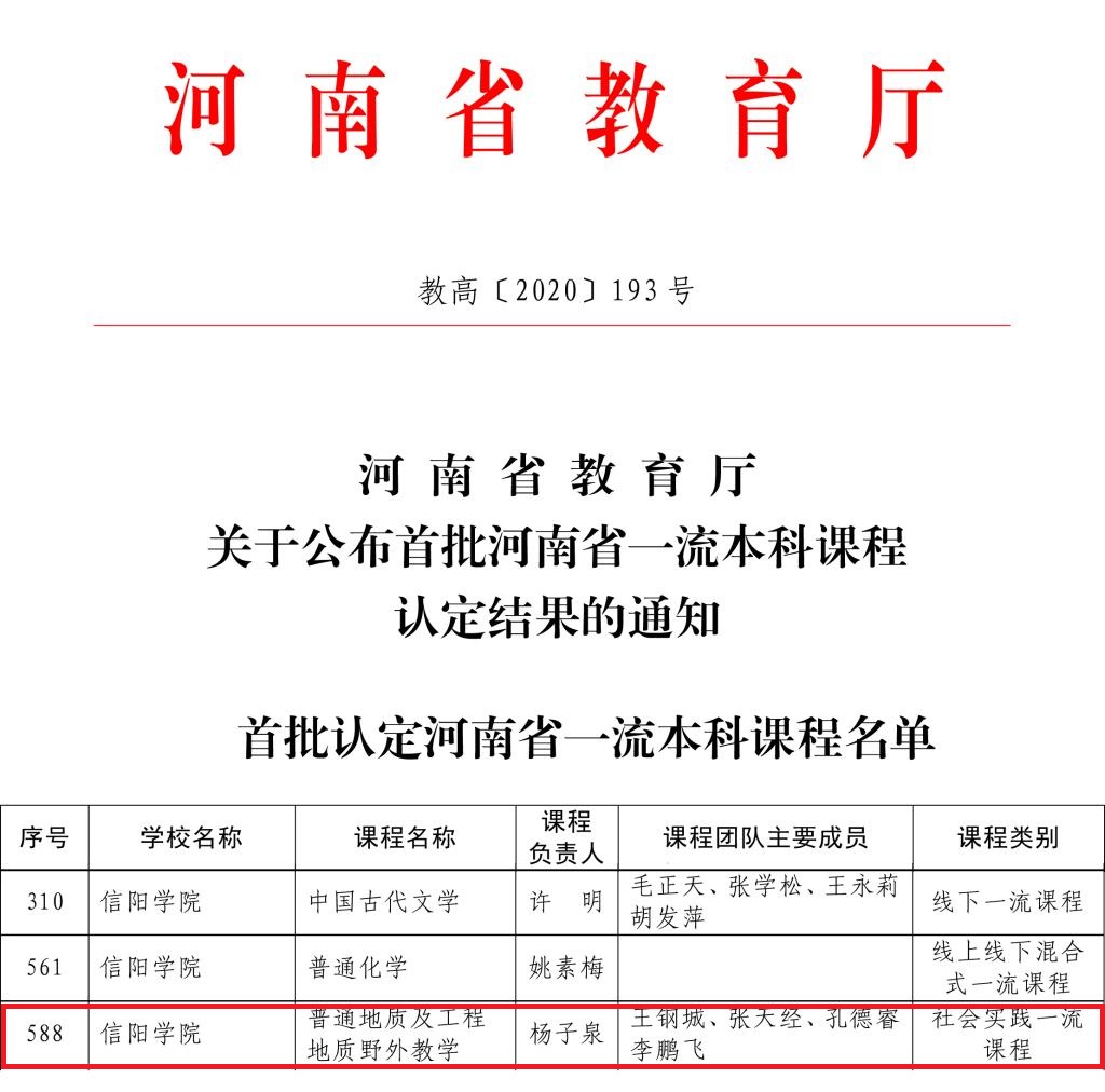 近日,河南省教育厅下发了《关于公布首批河南省一流本科课程认定结果的通知》(教高〔2020〕193号),我校申报的《中国古代文学》《普通化学》《普通地质及工程地质野外教学》三门课程分别被认定为省级线下、线上线下混合式、社会实践一流本科课程。其中,我院《普通地质及工程地质野外教学》被推荐申报国家级一流本科课程。