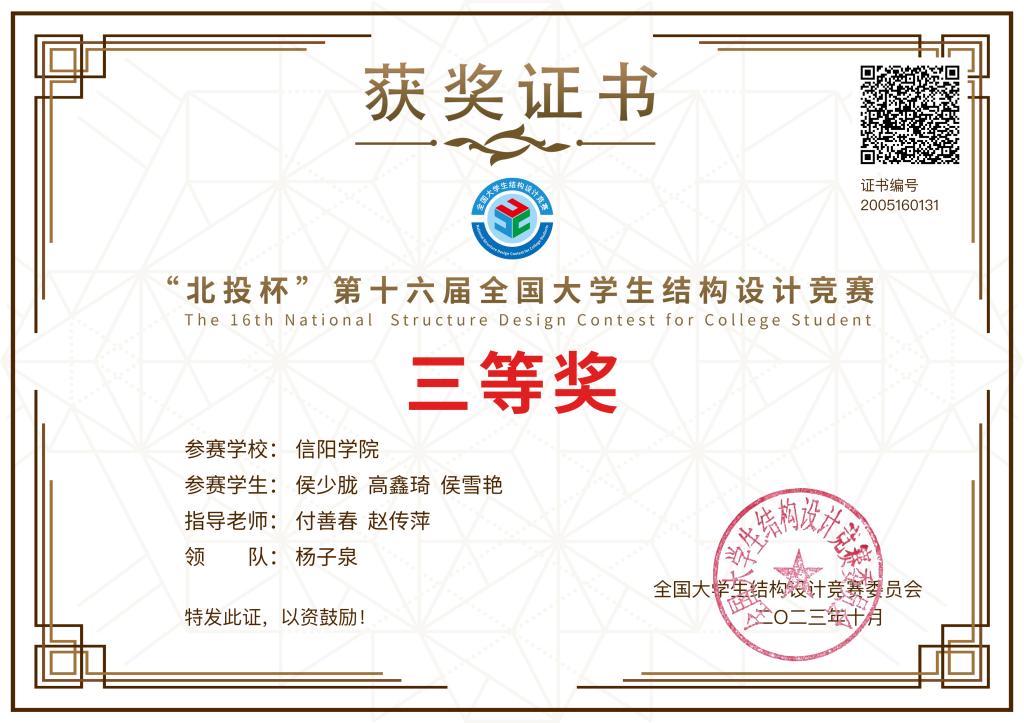 该竞赛于2023年10月25至29日在长沙理工大学举办,总决赛队伍在全国31个省(自治区、直辖市)组织分区赛的581所高校、1465支参赛队伍中评选产生,最终来自清华大学、浙江大学、同济大学等118所院校的119支代表队同台竞技;我校由土木工程学院副院长杨子泉任领队,付善春、赵传萍、杨子泉、周宜松任指导教师,侯少胧、高鑫琦、侯雪艳、邵婷婷、刘浩然、史乃恒6名学生组成的两支代表队参赛,两支代表队均获得全国总决赛三等奖。