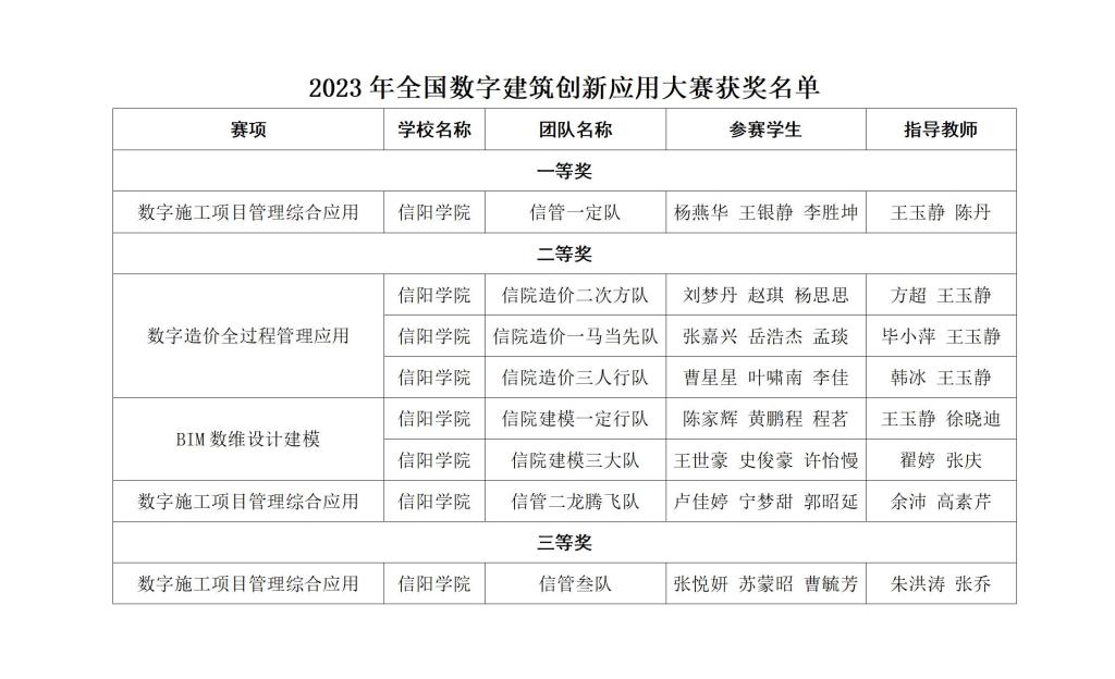 近日,2023年全国数字建筑创新应用大赛全国总决赛成绩揭晓。我校土木工程学院代表队在本次大赛中斩获本科组团队一等奖1项,团队二等奖6项,团队三等奖1项。