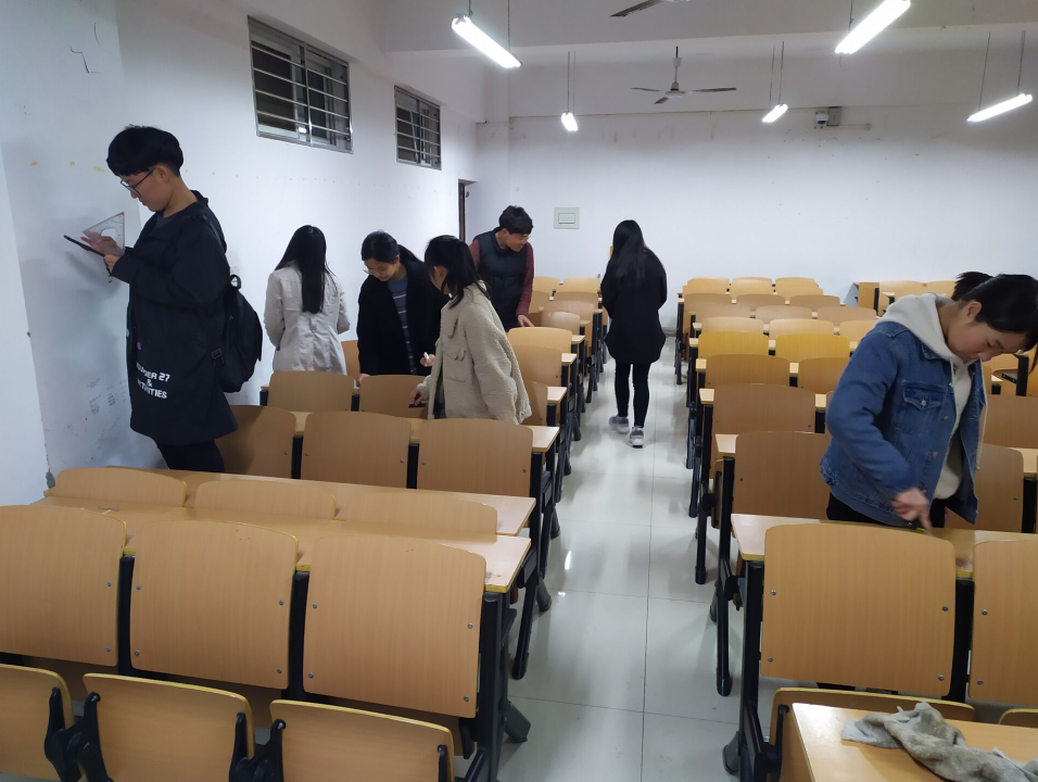 晚上18点,同学们在理工楼准时集合,每个人带来打扫卫生工具,带着饱满的热情,带着为同学服务的心态,开始了打扫教室活动。那地上的污啧,墙上的胶布,桌上的涂鸦,似乎乖乖的听话,被志愿者清理着。志愿者们分工明确,互帮互助,有的同学蹲在地上用铲子将地上的污渍轻轻的刮除;有的同学踩着板凳,将墙上的胶布一点一点的撕下;有的同学在充满涂鸦的桌子上,用橡皮轻轻地擦拭。没过多久,整个教室在志愿者的努力下,变得焕然一新!
