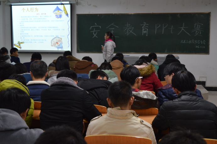 11月22日,土木工程学院在理工楼302教室举行安全教育PPT总决赛。学工秘书兼党总支副书记郗利选、团总支书记潘兵远、辅导员唐辉、吴琼茹及百余名学生观看了比赛。
