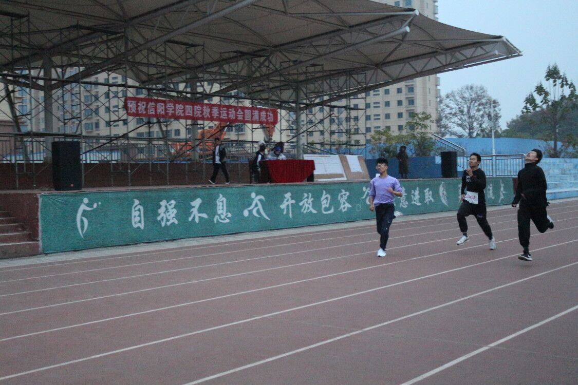 本次运动会上,四院运动员们将在100米、200米、400米、800米、1500米,三级跳、跳高、跳远上分别展开角逐,竞赛分为男子组和女子组,当比赛开始后,操场顿时沸腾起来,加油声,欢呼声充满了整个校园,主席台上主持人不断播放着投稿人给运动员送来的祝福,为运动员们加油打气。径赛场上的运动员们,一个个如矫兔般飞离起点,像利箭般冲向终点;其他项目的比拼,同样精彩,运动员个个摩拳擦掌,毫不示弱。跳高跳远的运动员为了得到更好的成绩,拼尽全力,即使失败也毫不放弃。他们面对目标跨出坚定的步伐,跳了一次又一次。这种不断超越自我的精神是个人的巨大财富,更是将来能够走得更高更远的稳固基石。