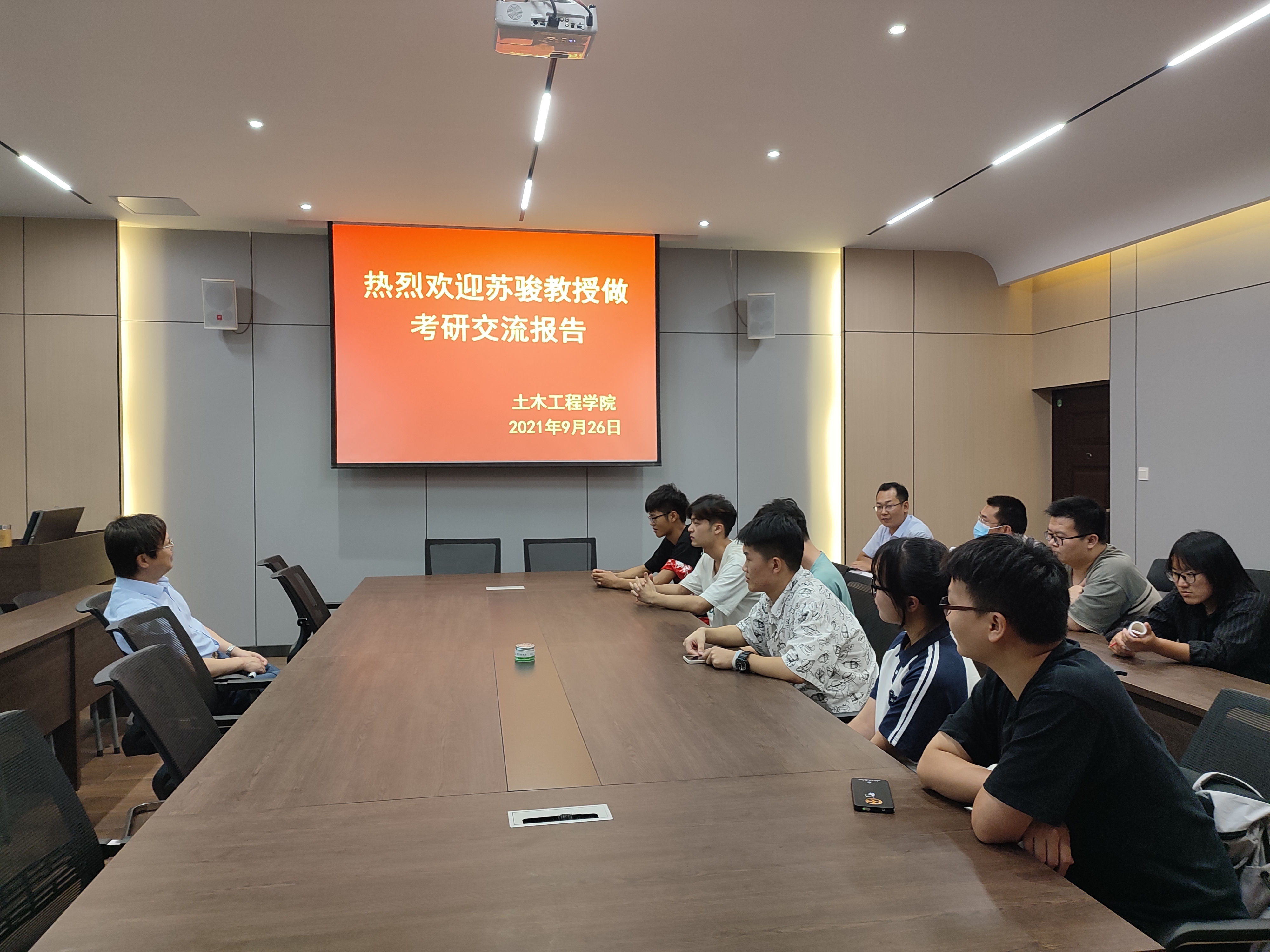 9月26日下午,土木工程学院在理工楼112会议室召开考研指导交流座谈会。湖北工业大学苏骏教授应邀为我院考研学子做考研辅导。教学副院长杨子泉、学工干事徐超、辅导员蔡大海、杨柳及部分考研学子参加了座谈会。座谈会由教学副院长杨子泉主持。