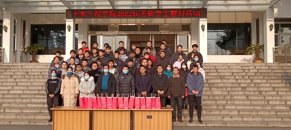 在考研即将来临之际,为进一步给考研学子加油鼓劲,树立必胜的信心,12月14日下午,土木工程学院在理工楼前举行了2022届考研学子慰问活动,名誉院长、党总支书记郭二军、教学副院长杨子泉、行政秘书郗利选、学工干事徐超、全体辅导员及2018级考研学子参加了本次活动。本次活动由徐超主持。
