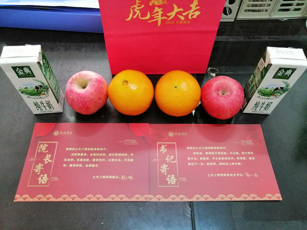 郭书记提醒同学们要注意疫情防控,并介绍了学院为大家准备的大礼包的寓意,“平平安安”,“牛气冲天”,“成功上岸”,期待着2022年捷报频传。