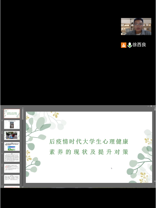本次讲座主要基于当前疫情防控常态化背景下,学生因封校学习生活而产生心理困扰开展的针对性的心理健康疏导。帮助当前大学生分析情绪现状和负面情绪产生的原因,并提出有效的解决方案,帮助大家更好地调整心理状态。