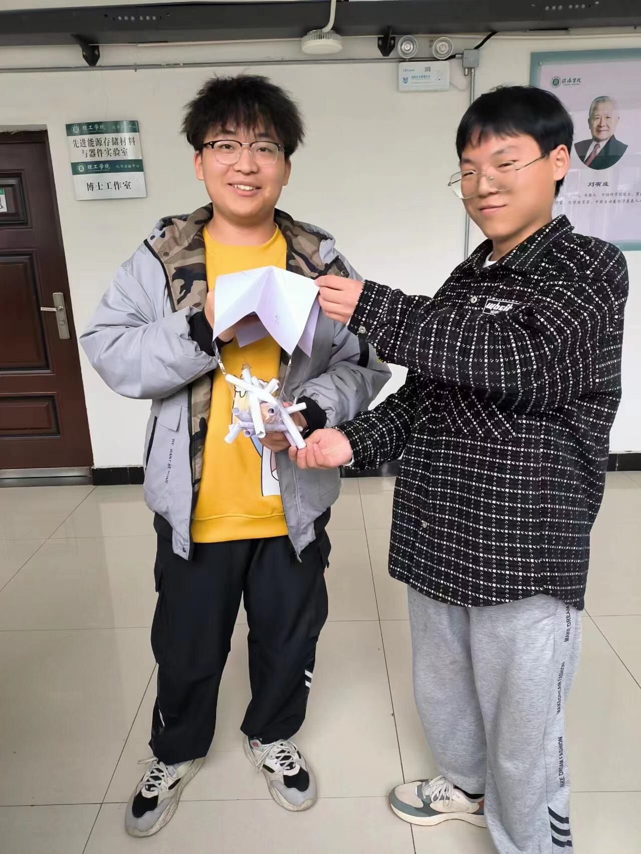 评委徐超、王冬冬老师综合各组模型内鸡蛋的破损情况以及模型结构、重量、大小等方面情况,评出本次比赛的优胜者,并为获奖小组颁奖。