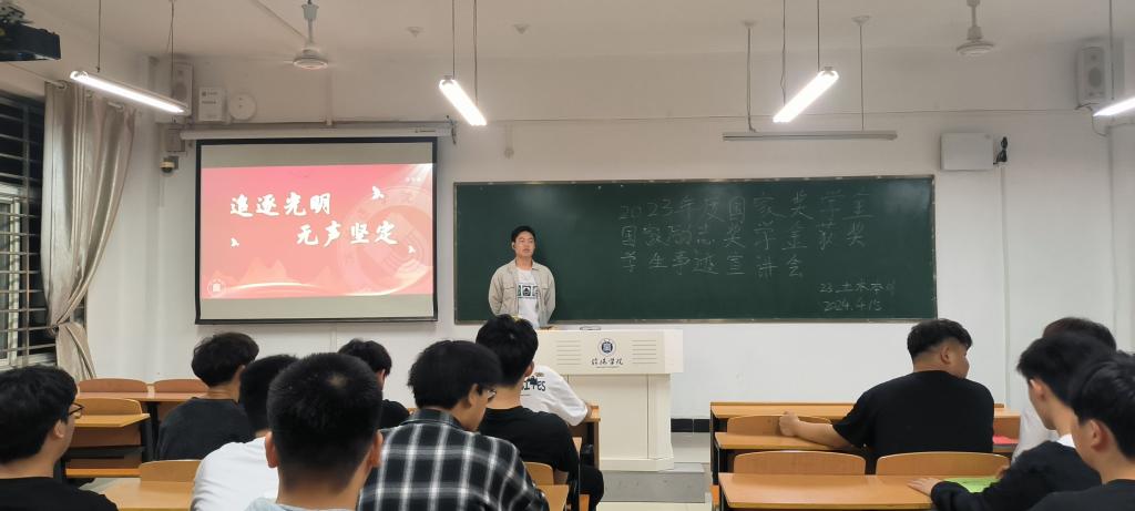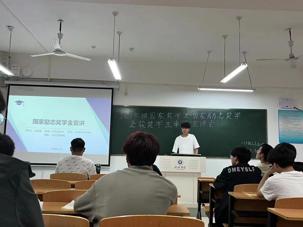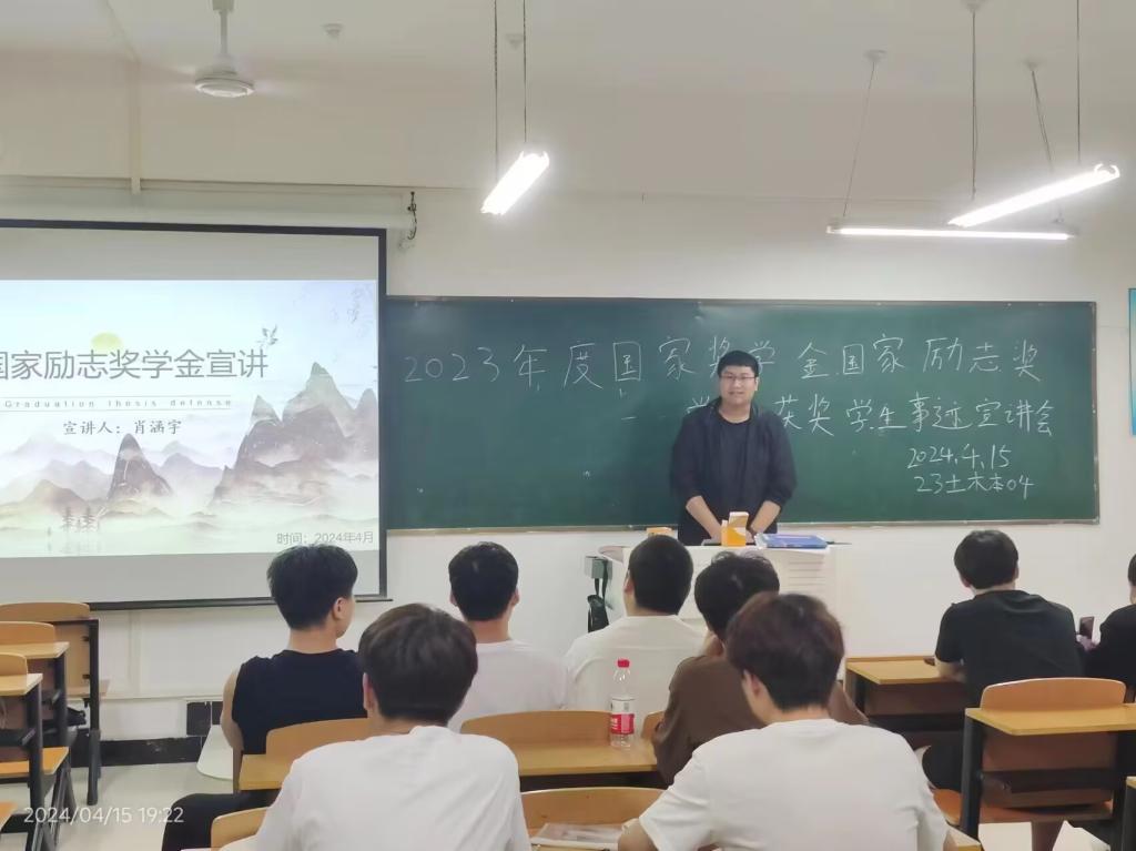 为进一步加强太阳集团,鼓励同学们向模范学习,2024年4月,土木工程学院开展了2022-2023学年度国家奖学金、国家励志奖学金获奖学生代表事迹宣讲会,获奖学生代表闵一楠、李晨飞、刘永豪、肖涵宇及学院2023级各班参加了宣讲会。宣讲会由秦怡博老师主持。