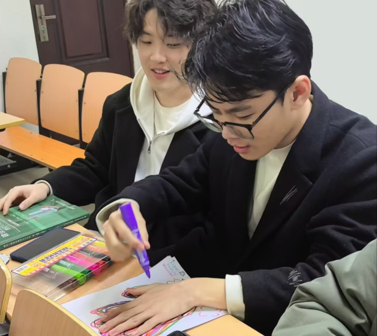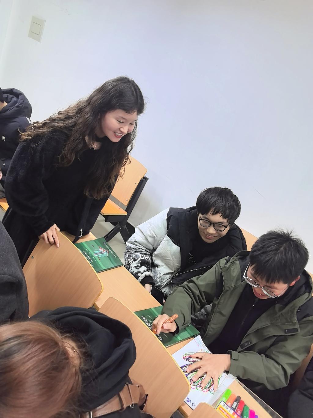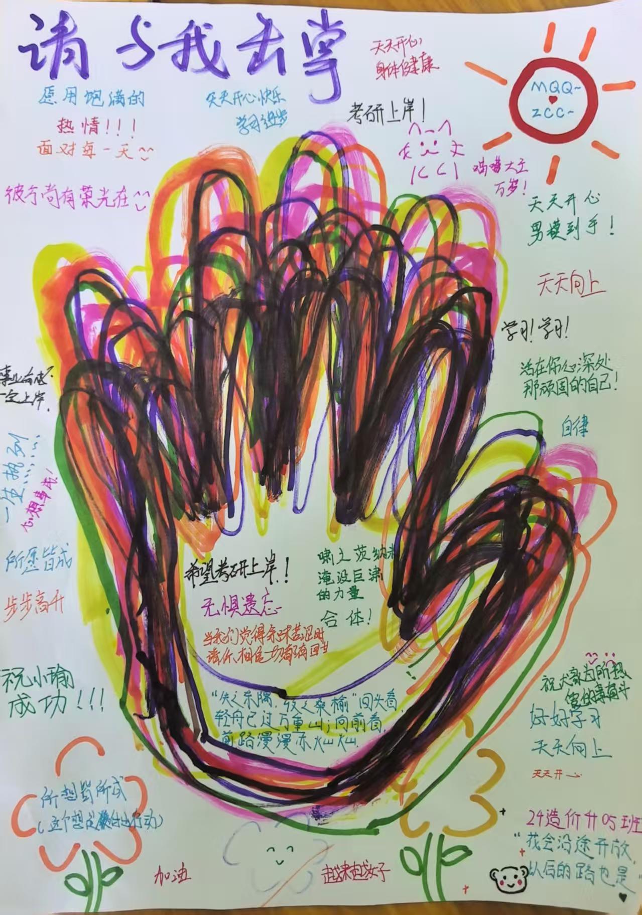 活动摒弃数字化技术,回归最原始的手工创作。学生们手持彩笔,用不同颜色的笔在白纸上描绘出自己手掌的轮廓,并且在手掌旁边写下自己的小心愿。辅导员现场引导:“描摹手掌的过程,是与自我对话的契机——那些曾被忽略的掌纹褶皱,恰似我们应对挑战时潜藏的力量。”