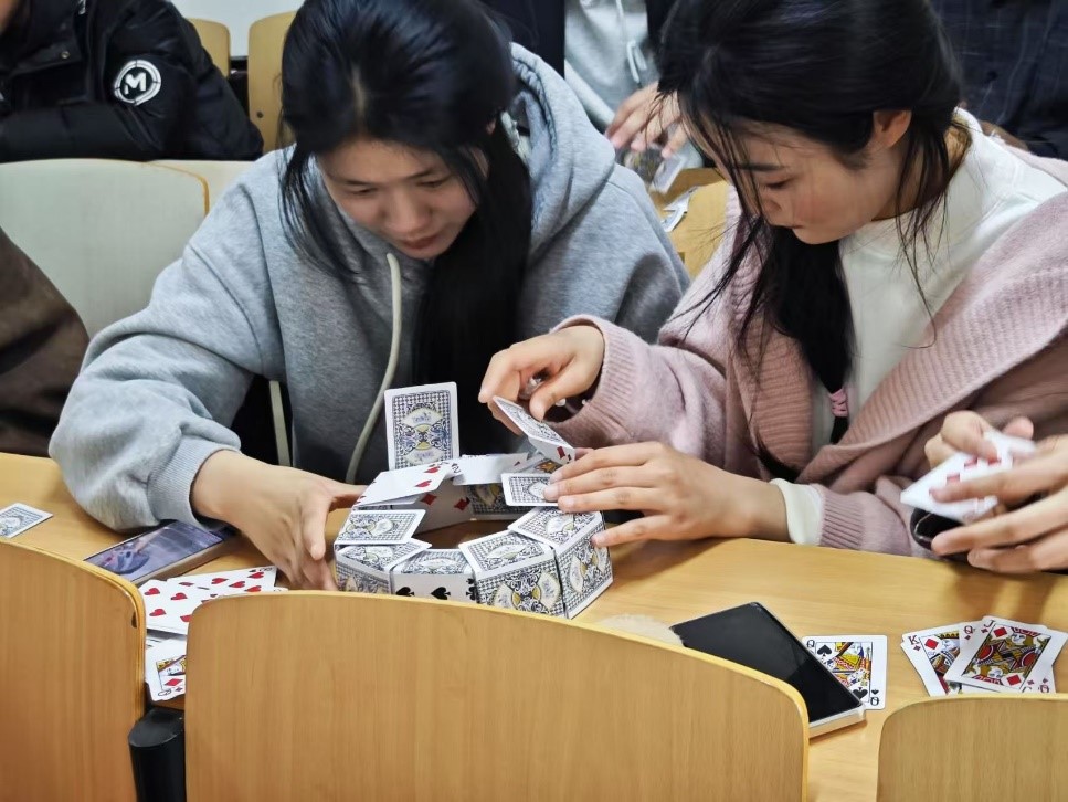 同学们以2-4人为一小组的形式自由组队参加大赛,比赛过程中,同学们根据课堂所学知识积极尝试构想的搭建方式,在不断的“倒塌”后逐渐定型,大家展开讨论并不断尝试,现场氛围十分热烈,参赛小组通力协作很快完成模型堆叠。