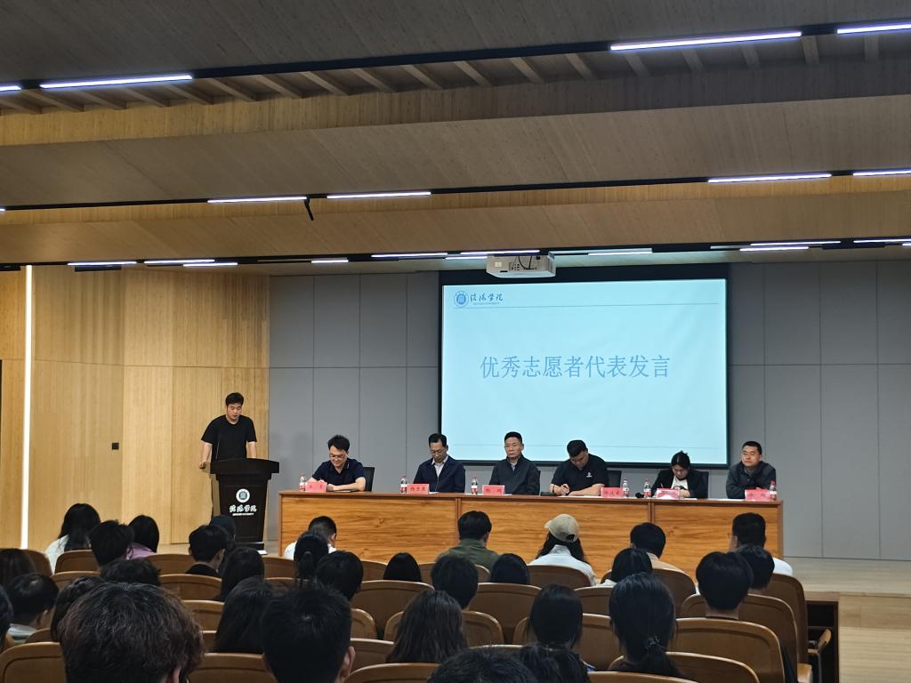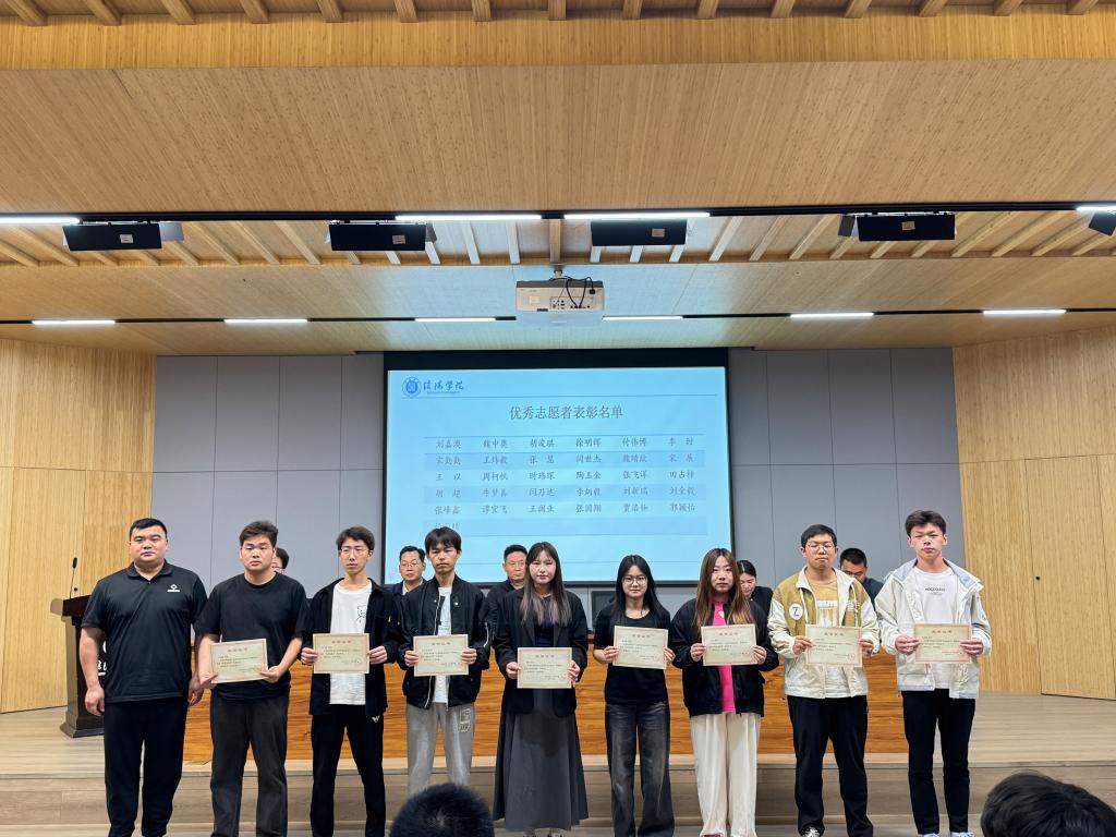 运动员代表李毅鹏以“成长、感恩与传承”为主题进行了发言。他分享了在体育赛场上的坚持,并感谢学院领导老师和服务团队的全力支持,呼吁同学们将赛场上的拼搏精神延续到学习和生活中。志愿者代表刘嘉澳讲述了服务赛事的点滴经历,传递了“奉献、友爱、互助、进步”的志愿精神,展现了土木学子团结协作的青春风采。