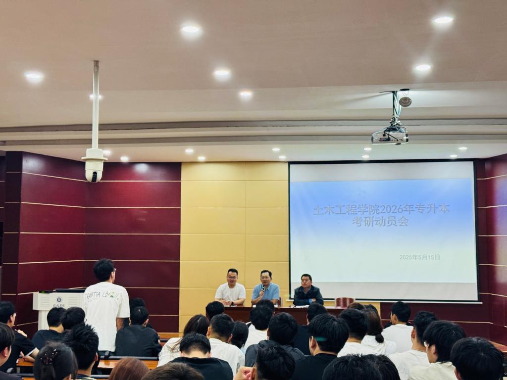 为使专升本学生树立考研信心,坚定努力方向,5月15日下午,土木工程学院在图书馆102报告厅召开了2026年专升本学生考研动员会。学院教学副院长杨子泉、学工干事徐超、辅导员刘泰虎及百余名学生代表参加了此次会议。