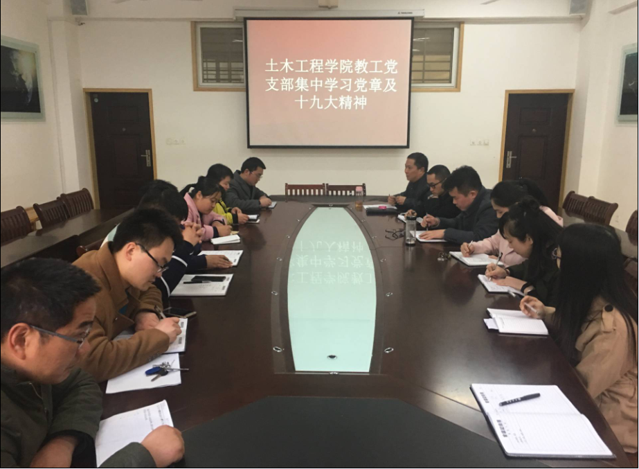 3月13日,土木工程学院教工党支部在理工楼2楼会议室集中学习了党章及十九大精神,该院总支书记潘卫国、教工支部书记郗利选及全体教师党员参加了学习活动。