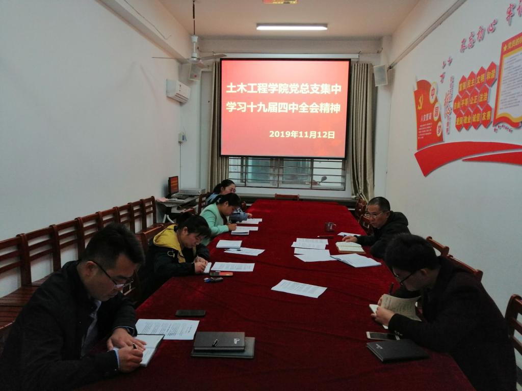 11月12日,土木工程学院党总支组织学习十九届四中全会精神,院党总支书记潘卫国、总支委员郗利选、徐超、王亮、方超、教工支部书记郗利选、学生党支部书记唐辉、吴琼茹参加。
