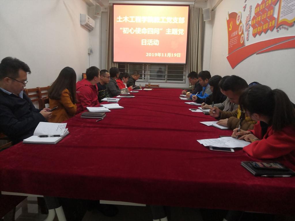 11月19日,土木工程学院教工党支部在理工楼112会议室开展了“初心使命四问”主题党日活动,学院党总支书记潘卫国、教工支部书记郗利选及全体教师党员参加了活动。