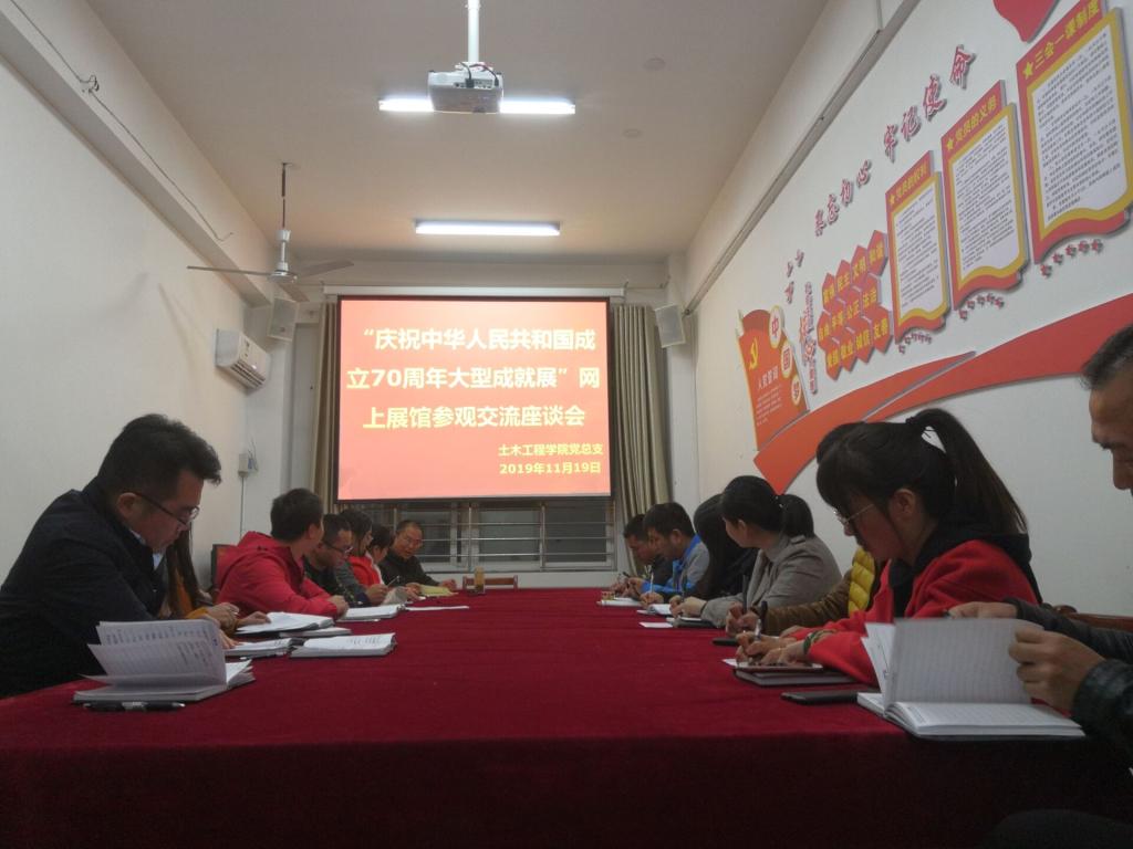 11月19日,土木工程学院党总支在理工楼党员活动室组织召开了“庆祝中华人民共和国成立70周年大型成就展”网上展馆参观学习交流会。院党总支书记潘卫国及全体教师党员参加了活动。
