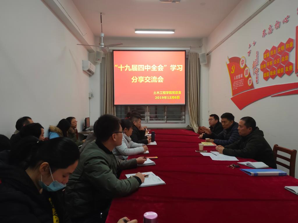 12月6日,土木工程学院党总支在理工楼112会议室组织召开了十九届四中全会学习分享交流会,校工会主席傅洪涛出席了会议,学院党总支书记潘卫国及全体中青年教师参加会议。