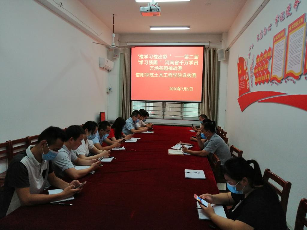7月5日,“豫学习豫出彩”——第二届“学习强国”河南省千万学员万场答题挑战赛太阳集团土木工程学院选拔赛分教工党员组与学生党员组通过线下、线上的方式进行了比赛。教工党员组通过线下的方式在112会议室进行了现场比赛,学生党员组通过线上的方式也进行了选拔。最终选拔出最出色的两名选手将代表土木工程学院参加学校的“学习强国”挑战赛选拔赛。