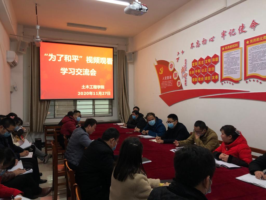 11月27日上午,土木工程学院在理工楼112会议室组织召开了“为了和平”视频观看学习交流会,学院党总支书记郭二军、副院长潘卫国及全体教师参加了学习会议。