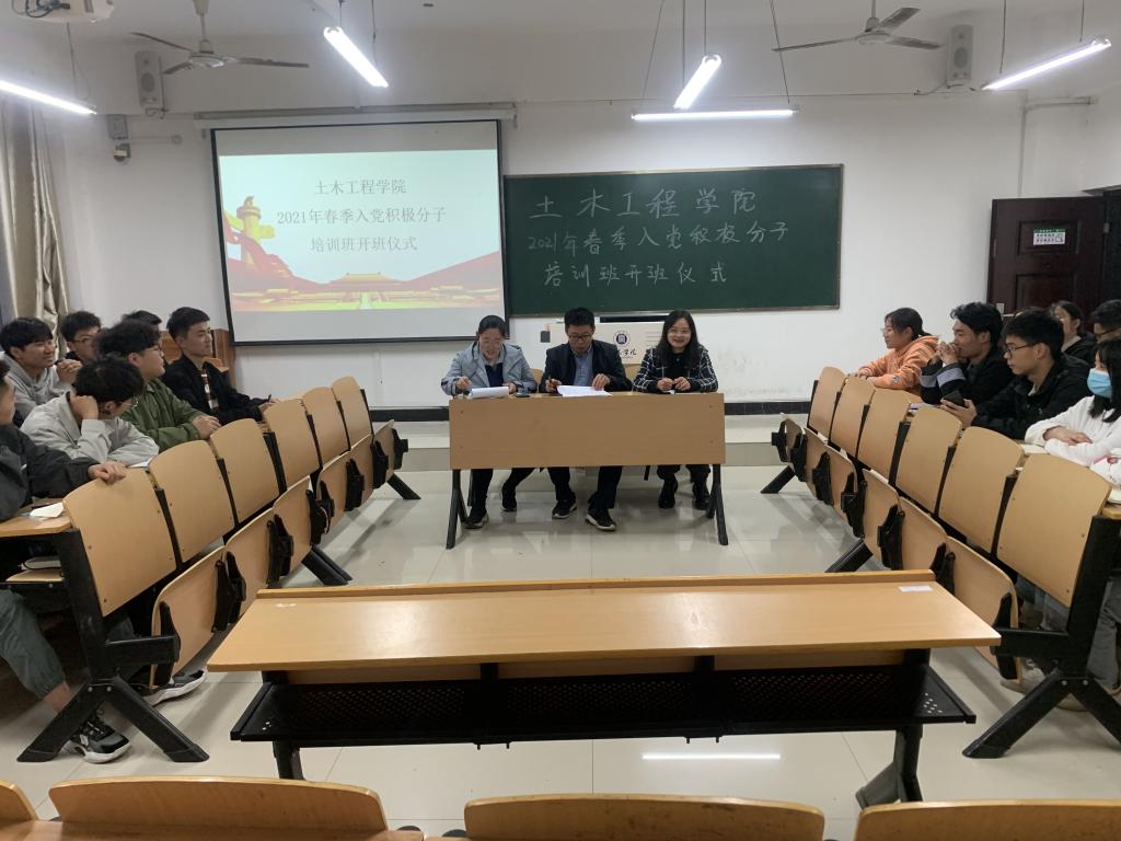 4月26日晚,土木工程学院在理工楼303教室举行了第十期入党积极分子培训班开班仪式,土木工程学院党总支副书记郭二军、学生第二党支部书记唐辉、辅导员杨柳及第十期23名入党积极分子参加了此次开班仪式。