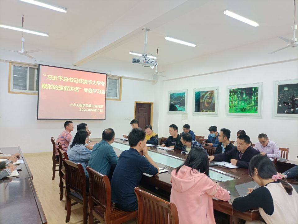 5月11日下午,土木工程学院教工党支部在理工楼201会议室集中学习了习近平在清华大学考察时的重要讲话。学院教工支部书记郗利选及全体教师党员参加了学习活动。