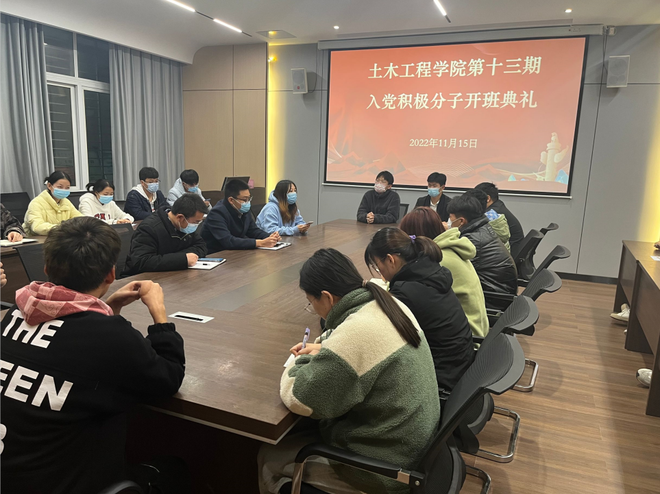 为了把伟大建党精神继承下去、发扬光大,加强入党积极分子的培养教育工作,切实提高大学生党员发展质量。土木工程学院党总支于11月15日在理工楼112会议室举行第十三期入党积极分子开班仪式,党总支书记郭二军,学工干事徐超,辅导员曹贞贞及第十三期入党积极分子参加了本次活动。仪式由曹贞贞主持。