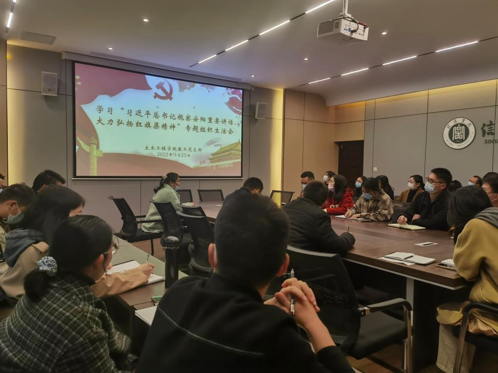 为深入学习贯彻党的二十大精神及习近平总书记视察安阳的重要讲话精神,深刻领会红旗渠精神的丰富内涵和时代价值,11月23日下午,土木工程学院教工党支部召开“深入学习习近平总书记视察安阳重要讲话精神,大力弘扬红旗渠精神”专题组织生活会,学院党总支书记郭二军及全体教工党员参加了此次会议,会议由教工党支部书记郗利选主持。