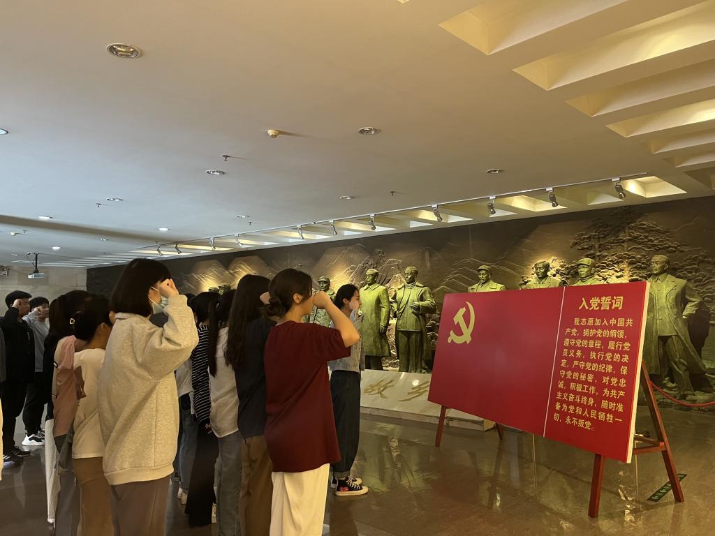 全体党员在党旗前庄严宣誓,重温入党誓词。随后在讲解员的带领下大家进入展厅,一起回顾了那段忍辱负重、硝烟四起的历史。在这片土地上,到处都是英雄的故事,家家都有英雄的事迹。最后到《开国大典》前,大家仿佛身临其境地经历了一段可歌可泣又艰难前行的烽火岁月。