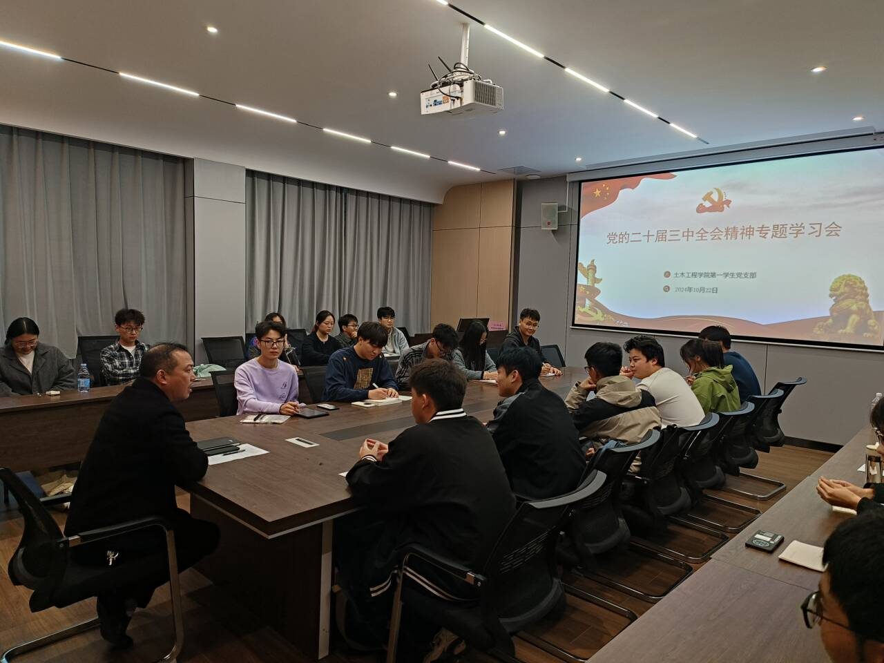 10月22日下午,学生第一党支部在理工楼112会议室召开了“学习党的二十届三中全会精神”专题学习会。会上,支部书记蔡大海领学了习近平总书记关于全面深化改革的一系列新思想、新观点、新论断。