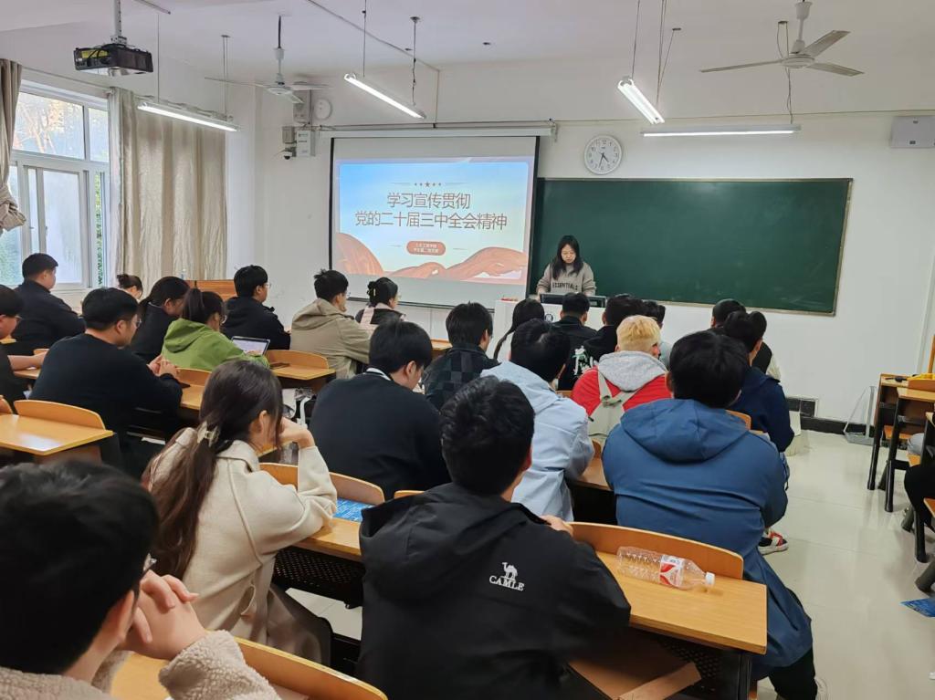 10月23日下午,学生第二党支部在理工楼301教室组织全体党员深入学习贯彻党的二十届三中全会精神。支部书记曹贞贞主持并带领大家深入学习了党的二十届三中全会公报,从全面深化改革的战略部署、高质量发展的目标要求,到创新驱动的迫切需求,对每一个细节都进行了详细剖析。同时强调作为新时代的青年党员,要紧密团结在党的周围,不断加强自身建设,提高党员素质,发挥先锋模范作用,带动身边同学共同进步。