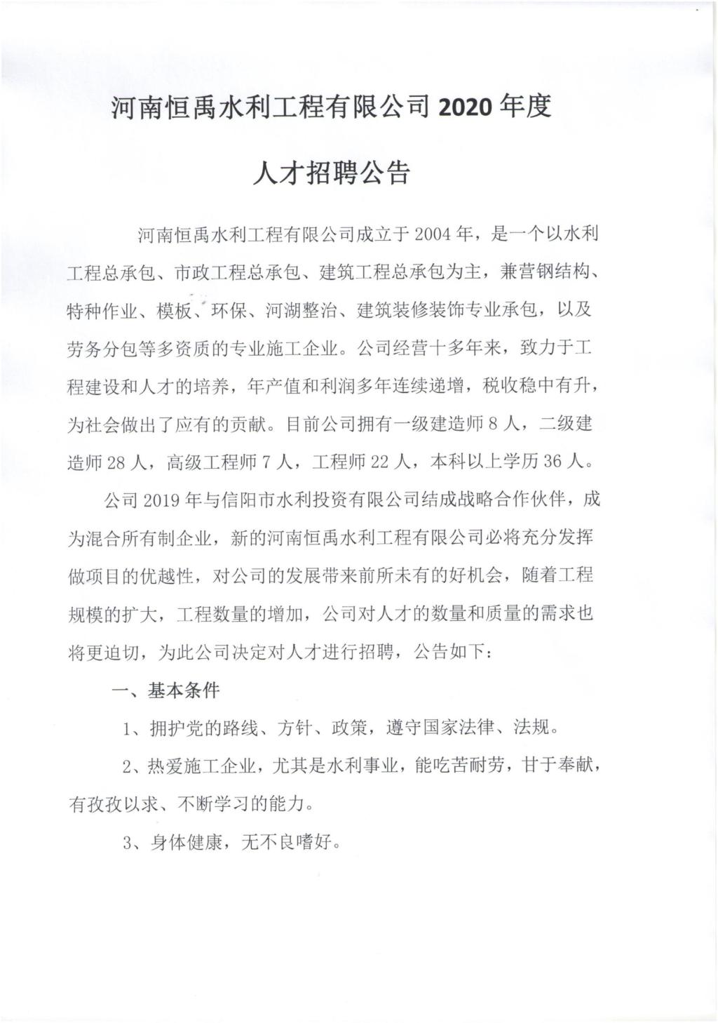 河南恒禹水利工程有限公司2020年度人才招聘公告