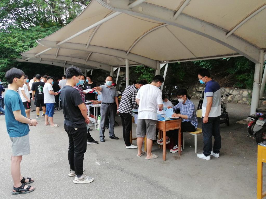 2020年5月29日上午,土木工程学院党总支书记潘卫国、教学干事王亮、学工干事徐超及毕业班辅导员,在空旷的理工楼前广场指导、协助毕业生领取毕业证、学位证等材料,因疫情防控需要,学院要求同学们只站一队,并且间隔一米以上进行排队,保证同学们安全有序领取。