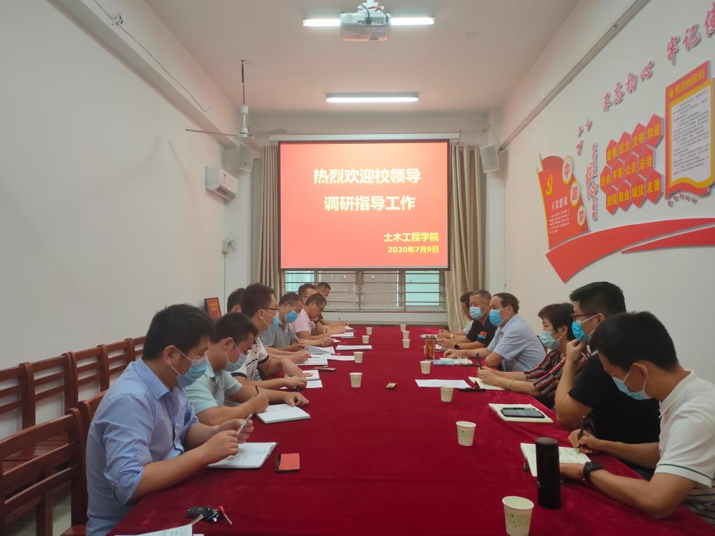 7月9日下午,校长王北生,副校长王强、人事处处长张凌江、教务处处长陈文涛及校办有关负责同志深入土木工程学院调研指导工作,与学院领导班子在理工楼112会议室进行了交流座谈。