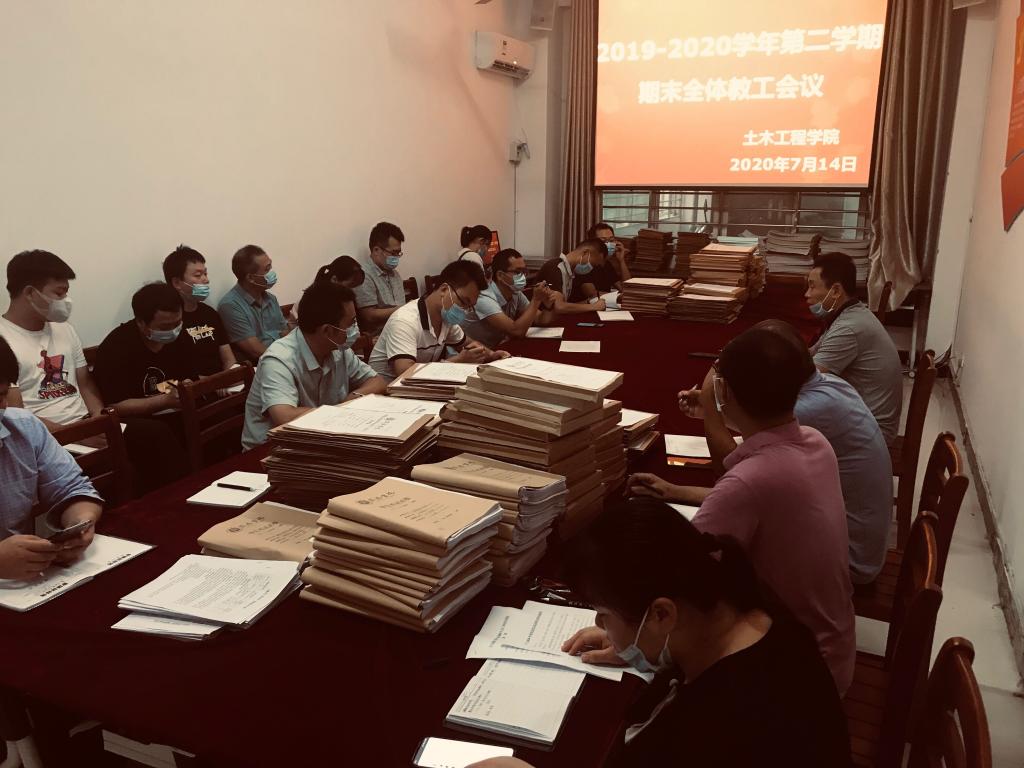7月14日下午,土木工程学院召开了2019-2020学年第二学期期末全体教工会议,会议以线上线下相结合的方式召开,名誉院长,副院长兼党总支书记潘卫国、行政秘书郗利选、教学干事王亮、学工干事徐超及全体教师参加了会议。