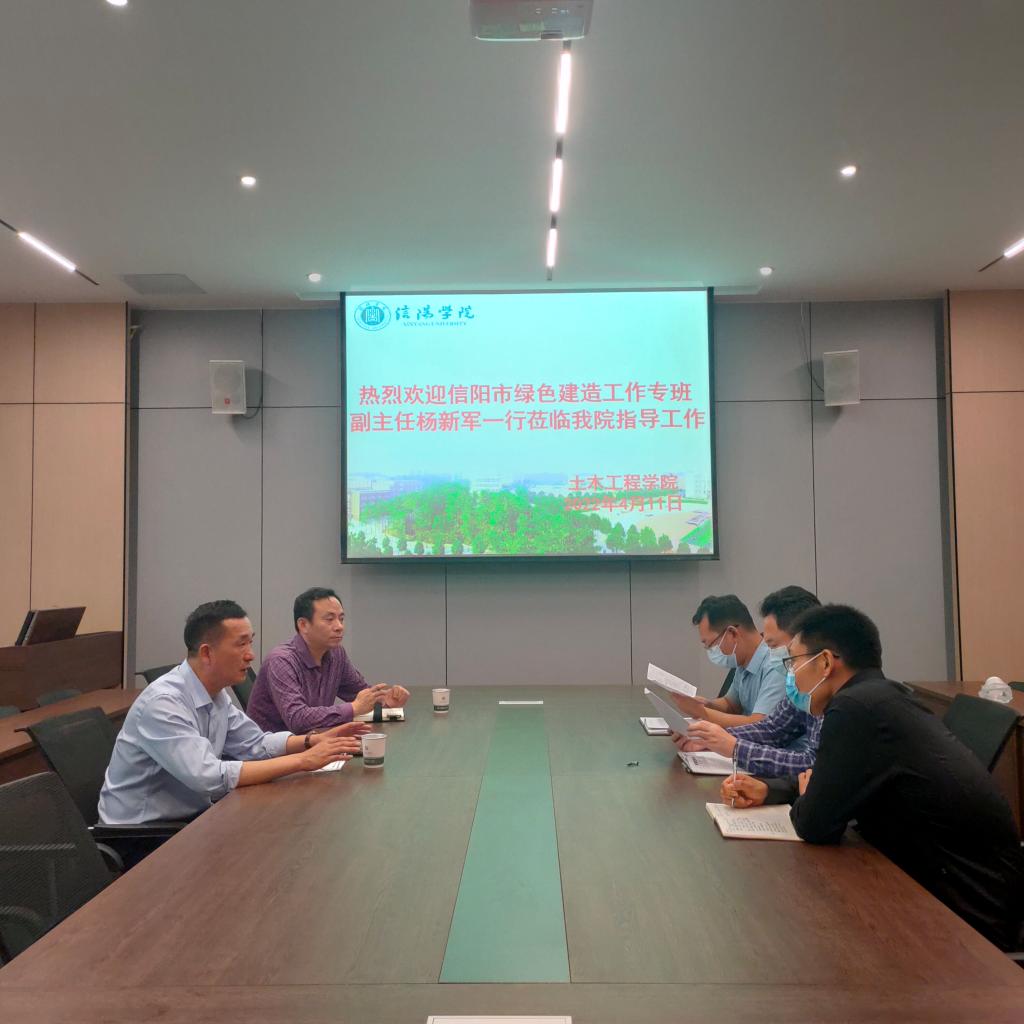 4月11日下午,信阳市绿色建造工作专班副主任杨新军一行到土木工程学院进行考察交流,双方在理工楼112会议室进行了座谈。土木工程学院名誉院长、党总支书记郭二军、教学副院长杨子泉、行政秘书郗利选及学院实验中心主任李鹏飞参加了座谈会。