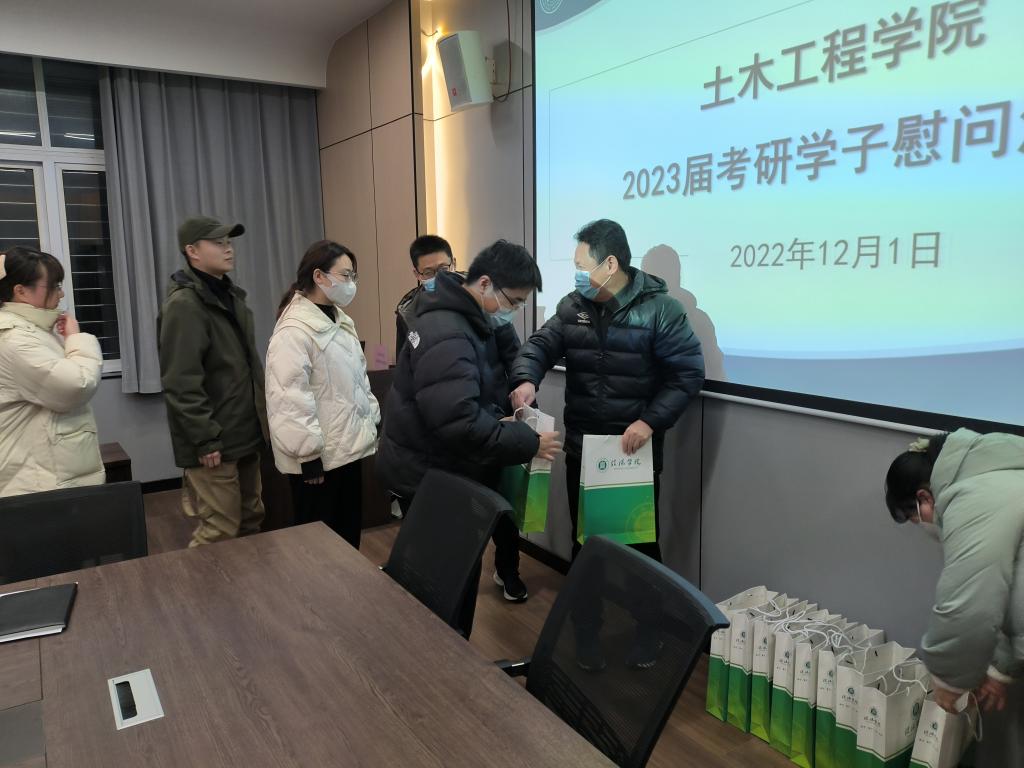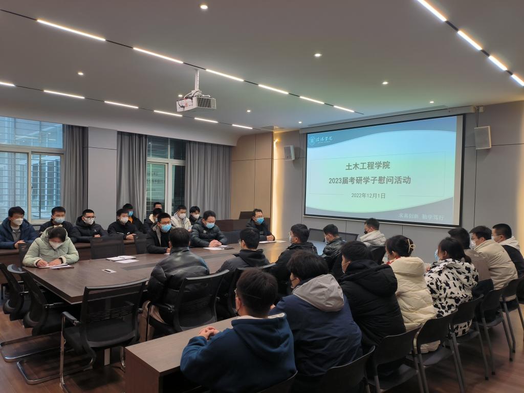 在研究生考试即将来临之际,为进一步给考研学子加油鼓劲、树立必胜的信心,12月1日下午,土木工程学院在理工楼112会议室举行了2023届考研学子慰问活动,学院名誉院长,党总支书记郭二军,教学副院长杨子泉,行政秘书郗利选,学工干事徐超,毕业班辅导员及2023届考研学子参加了本次活动。本次活动由徐超主持。