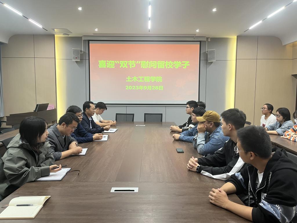 值中国传统节日中秋节、国庆节双节来临之际,土木工程学院留校学生的情况一直牵挂着领导老师的心。为使在外求学学子感受到团圆的幸福,9月28日下午,土木工程学院喜迎“双节”慰问留校学子活动在理工楼112会议室举行,学院党总支书记郭二军、教学副院长杨子泉、学工干事徐超,全体辅导员与学院留校学生一起参与了此次活动。此次活动由徐超主持。