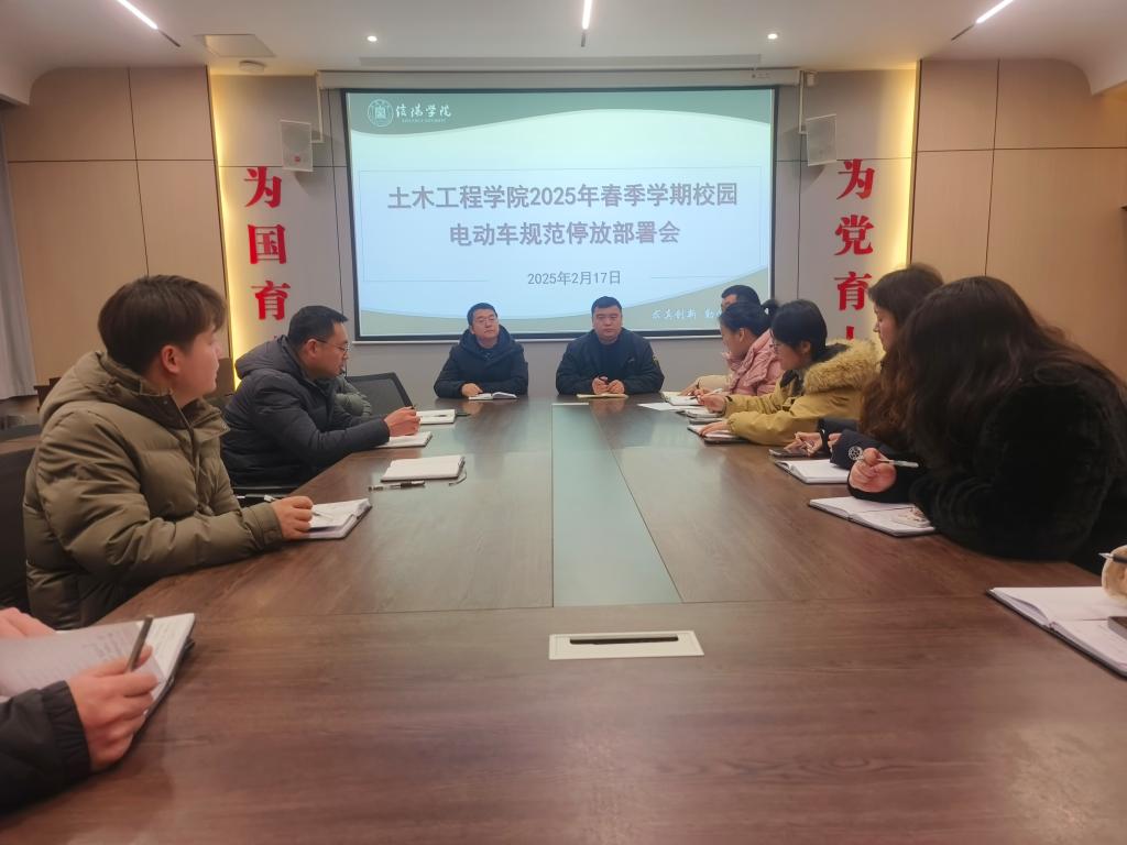 为营造安全有序的校园环境,巩固电动车治理成果,进一步规范电动车停放,2月17日,土木工程学院组织召开了2025年春季学期校园电动车规范停放部署会议。学院党总支书记徐远东、学工干事徐超、全体辅导员参加了会议。
