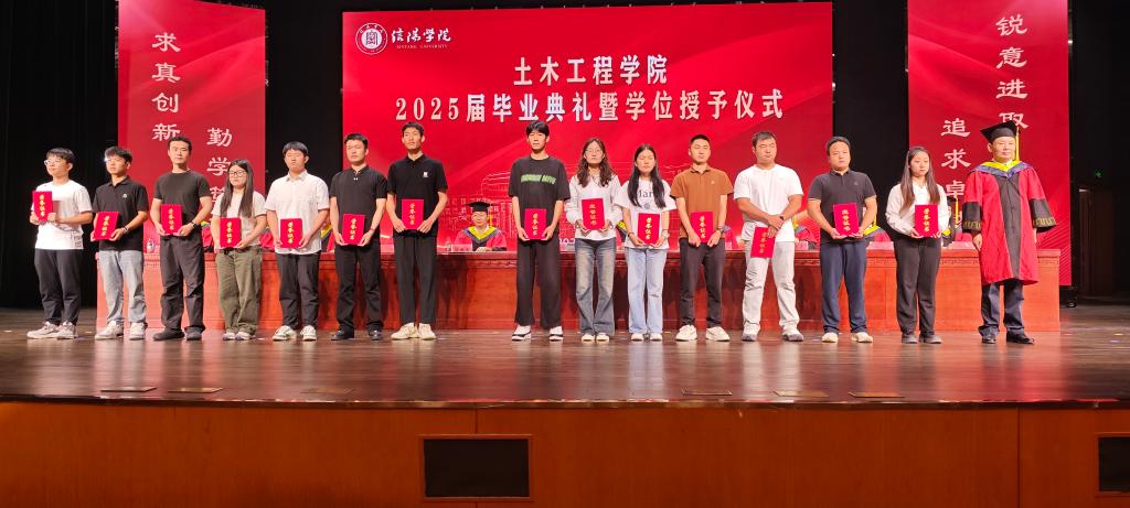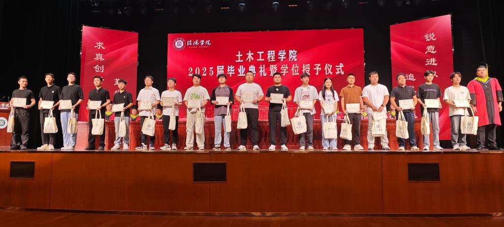 王亮宣读了《关于授予土木工程学院2025届毕业生学习标兵荣誉称号的决定》并通报了2025年学院考研情况;徐超宣读了《太阳集团土木工程学院关于聘任2025届校友联络员的决定》;郗利选宣读了《关于表彰2025届优秀毕业生的决定》;鲍鹏、徐远东、杨子泉分别为省级优秀毕业生、院级学习标兵及校友联络员颁发证书、聘书及纪念品。