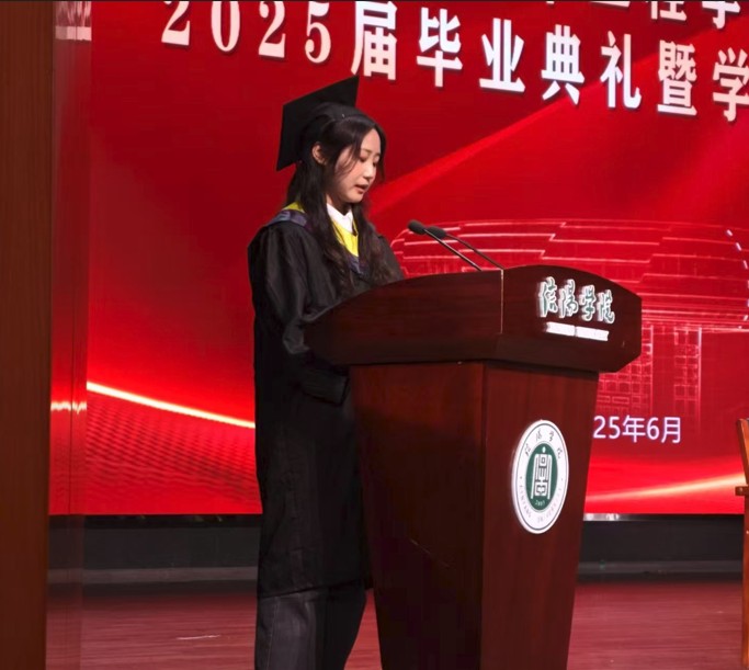 毕业生代表、河南省三好学生、第十五届校园明星、2023年全国数字建筑创新应用大赛项目管理赛项个人一等奖、考取双一流高校长安大学土木水利专业研究生杨燕华同学在发言中向老师们表达了由衷的感谢和敬意,分享了四年来的成长历程与收获,并表示会继续坚定自己的信念,脚踏实地、追逐美好未来。