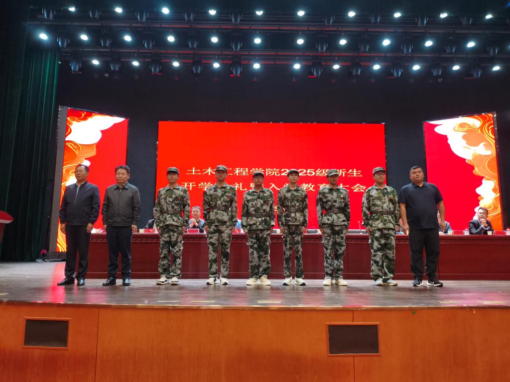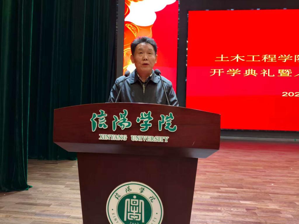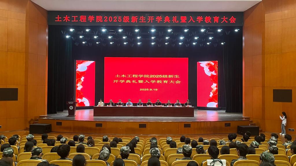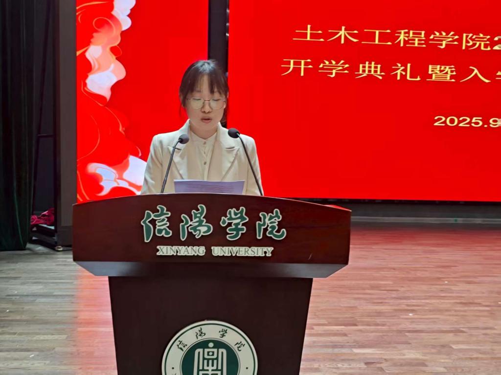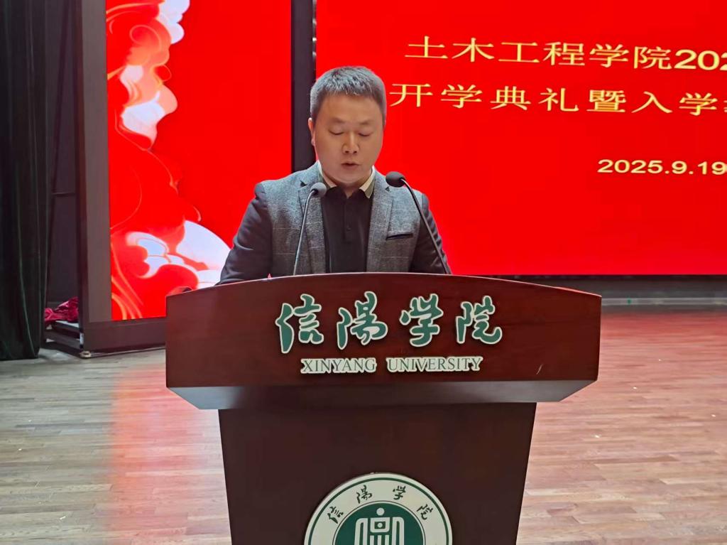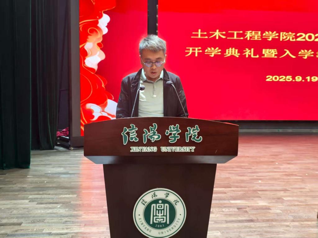 9月19日,土木工程学院2025级新生开学典礼暨入学教育大会在浉河校区音乐厅隆重举行。学院名誉院长鲍鹏、党总支书记徐远东、教学副院长杨子泉、行政秘书郗利选、教学干事王亮、学工干事徐超、土木工程教研室主任付善春、工程造价教研室主任方超、智能建造教研室主任黄小林、人居环境科学与技术教研室主任韩冰及全体辅导员和2025级全体新生参加了本次典礼。典礼由徐远东主持。