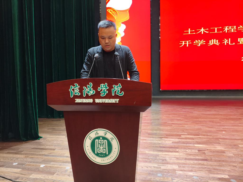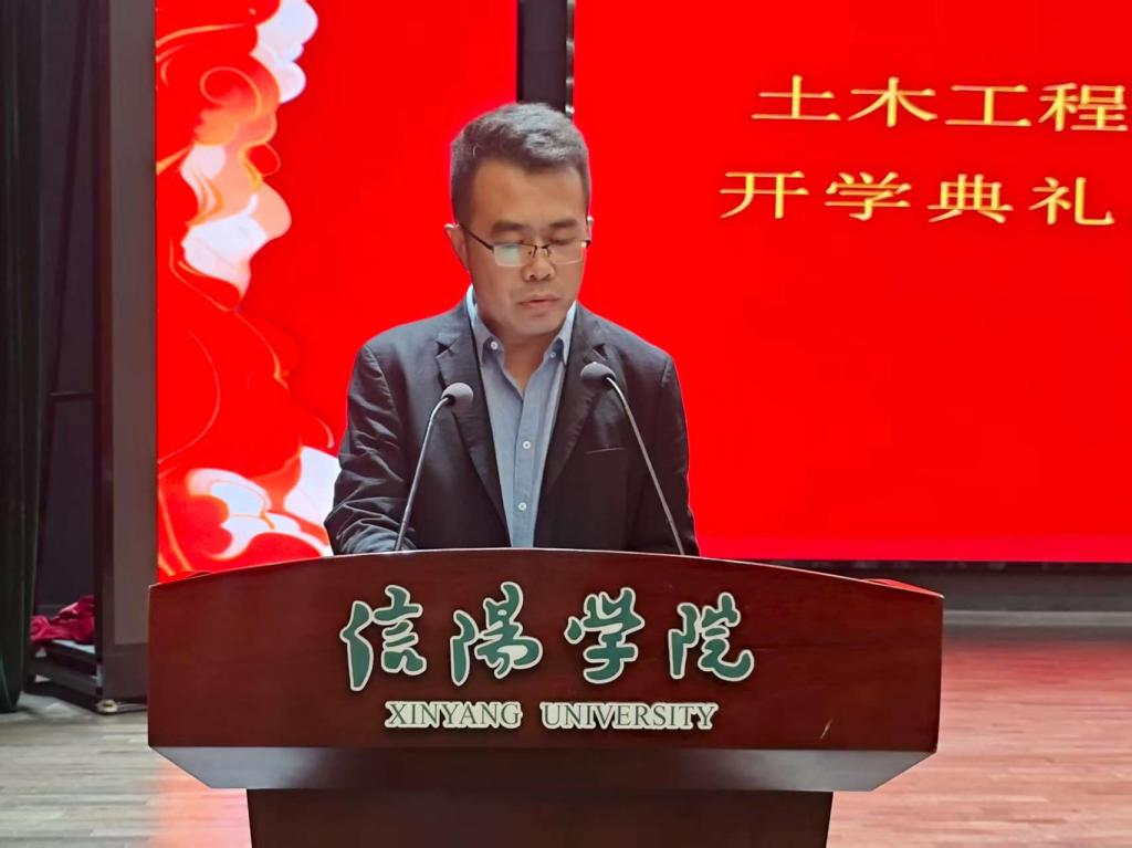 河南省教育厅学术技术带头人余沛副教授作为教师代表进行了发言,他指出大学不仅是知识的殿堂,更是价值观的熔炉,同学们选择的不仅是一门专业,更是一份跨越千年的使命。并与同学们分享了三句话:“扎根”:土木人成长的必由之路;“突破”:开启土木工程新未来;“共生”:绘就未来城市和谐画卷。